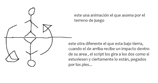 E conseguido hacer disparos pero por animación, no se instanciar de momento….de todas formas combinando animaciones y scripts para ellas e conseguido también derribar enemigos y cambiarles la animación, no exactamente la animación del personaje que recibe el disparo, pero e echo un clon del mismo que no se ve porque esta debajo del que sale en el terreno de juego, al recibir un disparo el que se ve da un giro inapreciable a la vista y asoma el que estaba dentro del suelo, el de dentro del suelo tiene una animación de desmayo y derribo y de encima del terreno de atacar, pues e conseguido darle la vuelta y no se aprecia el cambio, cuando se ejecuta el juego parece el mismo personaje que a cambiado sus movimientos……...al haber recibido un disparo o un golpe,